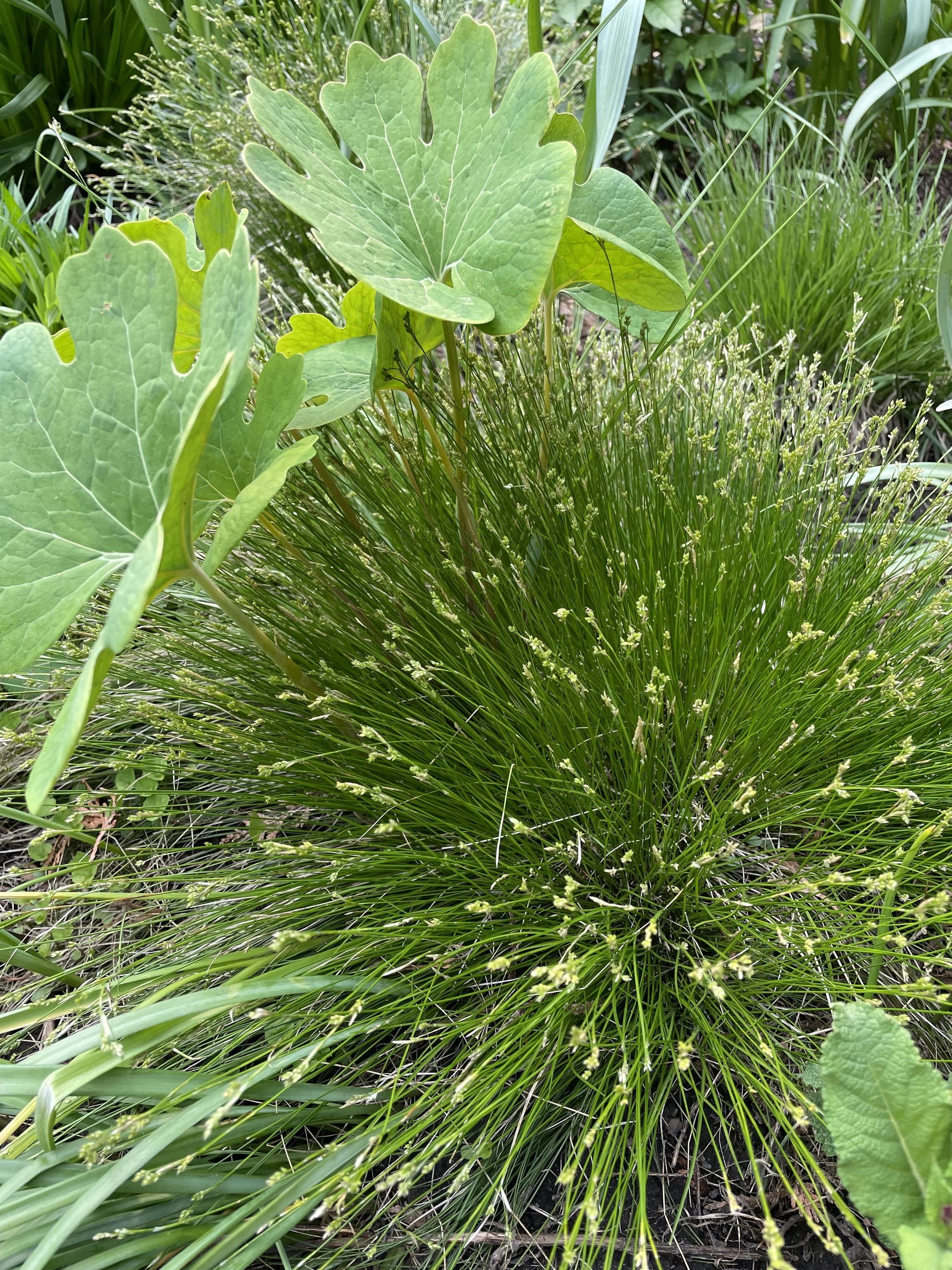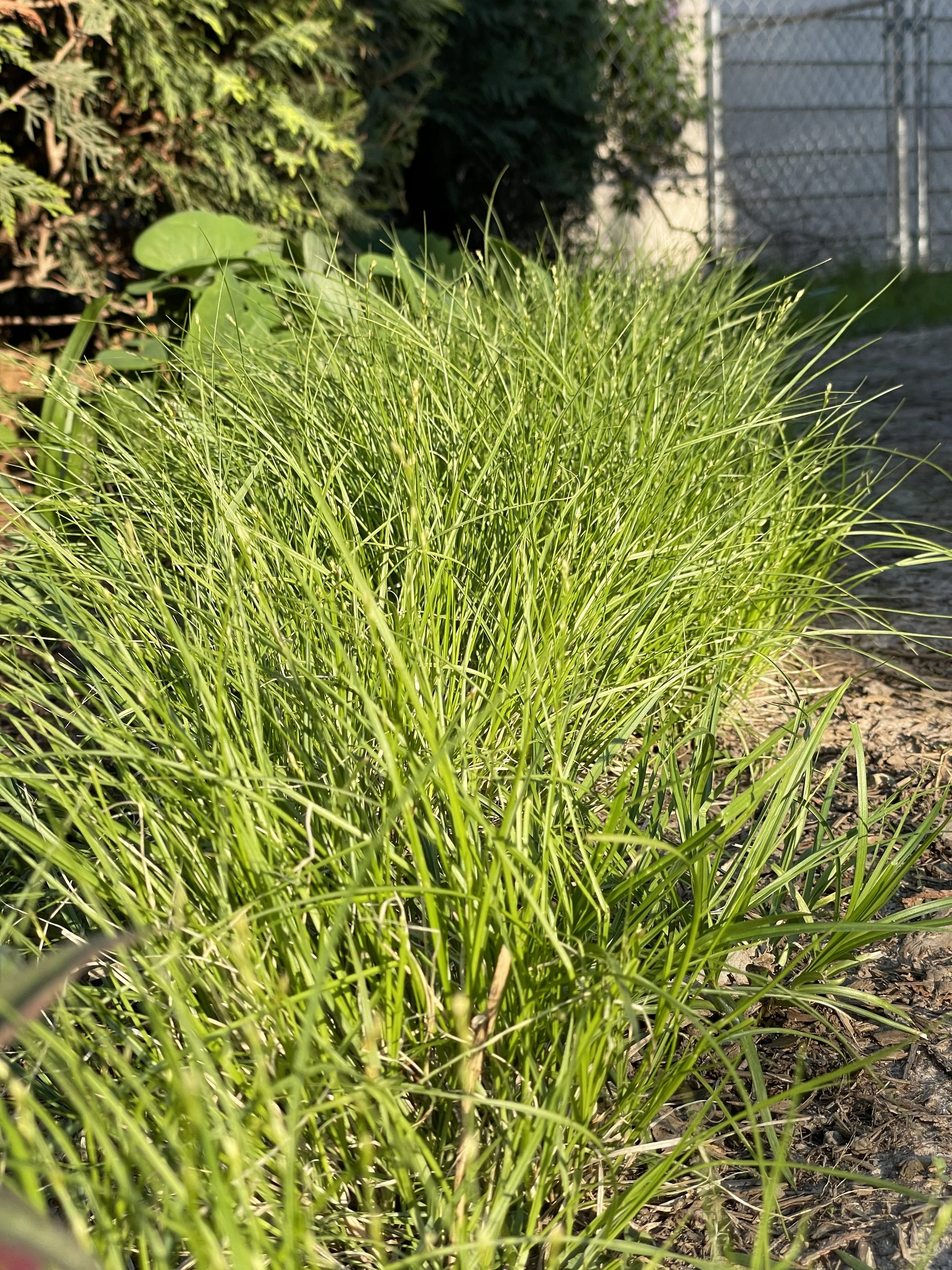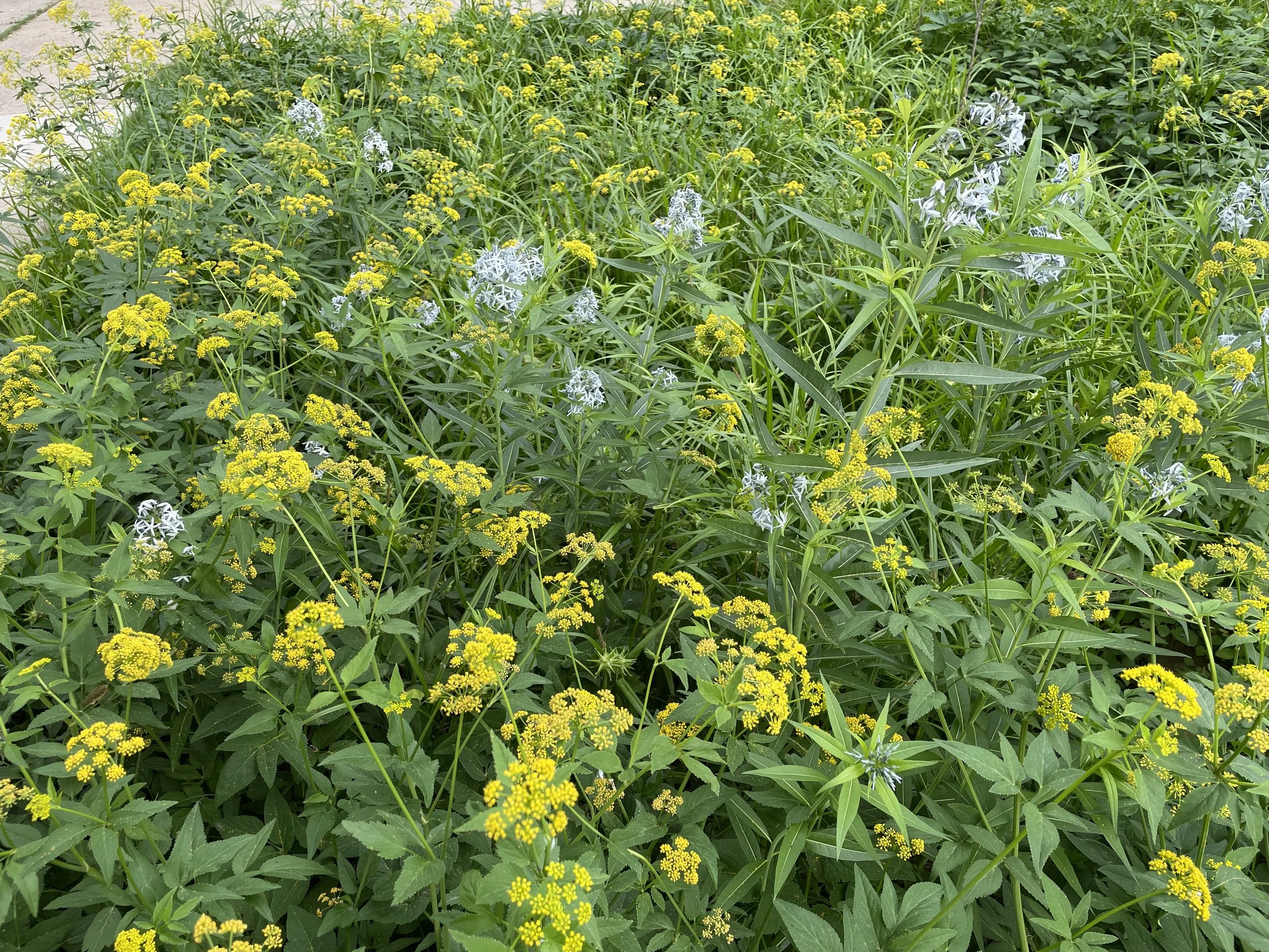 The textural contrast between Gray’s Sedge and Golden Alexander foliage is subtle but one of my favorite aspects of the planting. Gray's Sedge is also known as Morningstar Sedge, you can see the star shaped seed heads in the picture above which resemble a medieval Morningstar weapon.