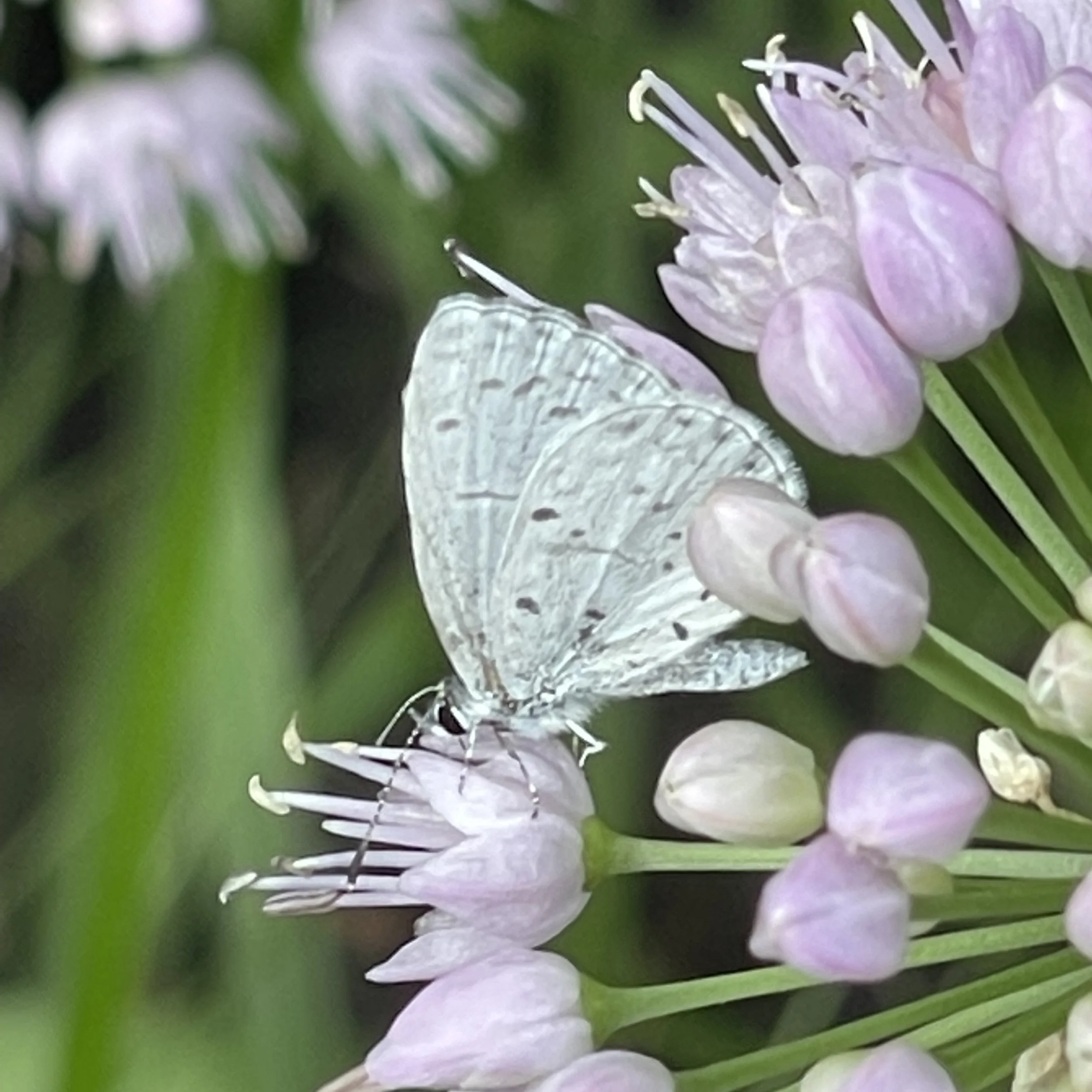 Pollen and nectar of New Jersey Tea’s white flowers (background) provide food for a variety of insects including bees, butterflies, moths, wasps, flies and beetles. In return the plant accomplishes its singular mission of reproduction as pollen is transferred from one flower to another. The plant also provides food for a number of butterfly caterpillars such as Spring/Summer Azures and Mottled Duskywings. A Summer Azure is pictured above feeding on Wild Onion nectar.