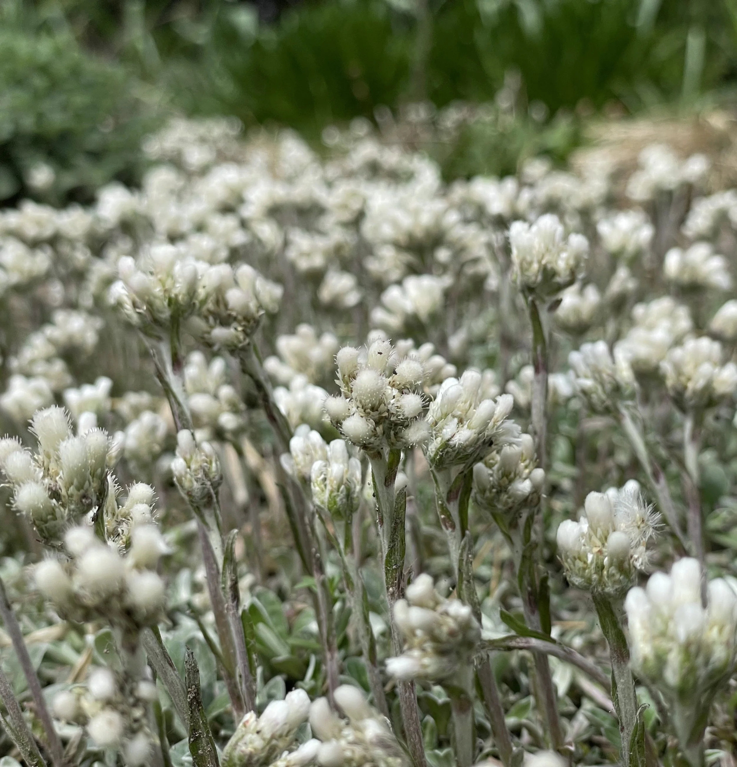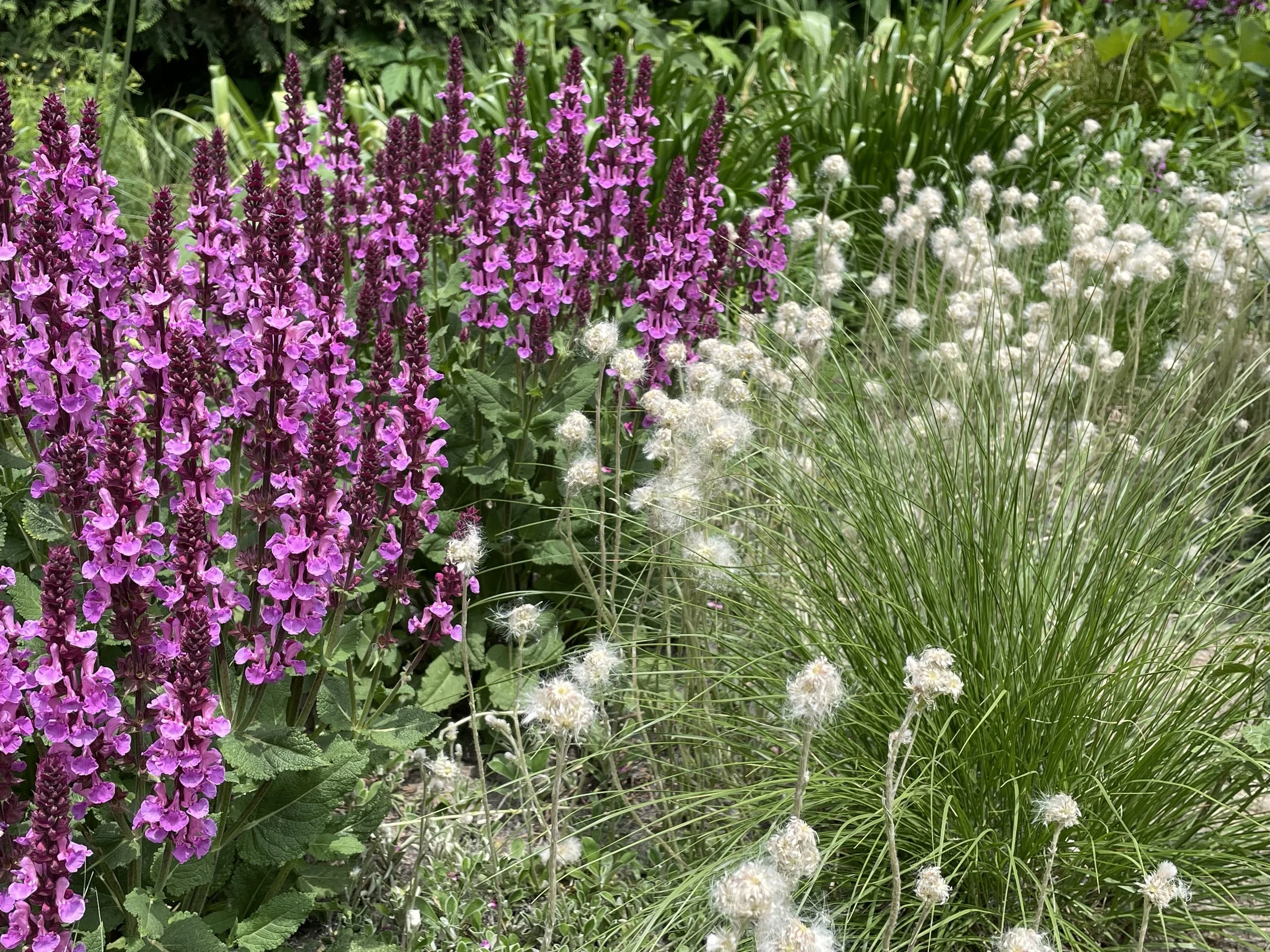 Pussytoes is a diminutive plant whose foliage doesn’t reach much more than 2”-3” height. The white flowers bloom in late spring and look like cat’s feet and the seed heads like wispy cotton. Pictured here with perennial Salvia, Pussytoes is a larval host for the American Painted Lady butterfly. It is great for planting around and under taller plants not only for it’s unique beauty but also for it’s weed suppressing ability.