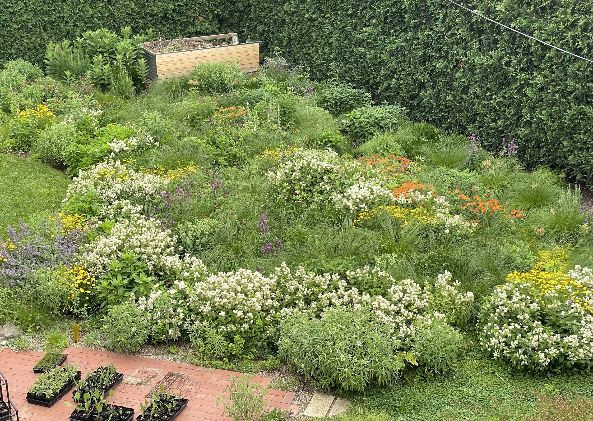 Prairie Dropseed is the main structural plant in the back garden, forming a matrix which lends some legibility and unity to the planting design. Dropseed is an obligate host to two species of tree hoppers and the seeds are eaten by a number of sparrows and juncos from fall into winter. It’s very beautiful as well!