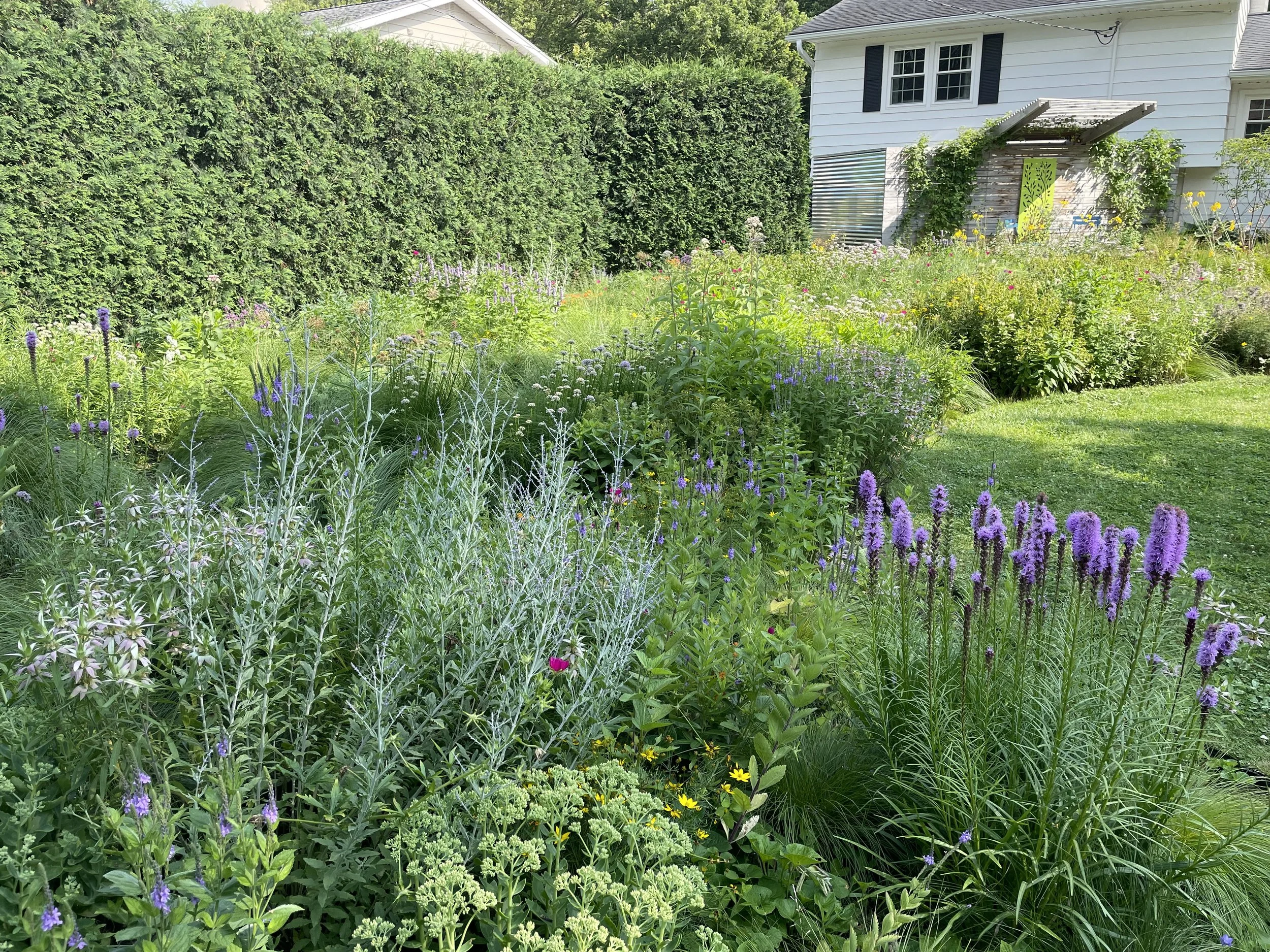 In 2008 I designed and installed a raingarden in this street facing corner of the garden. Plantings included Prairie Blazingstar, Turtlehead, Little Bluestem, Golden Alexander, Gray's Sedge and others. Unlike traditional landscaping I let the plantings do their own thing for the most part, as they would in a natural setting.